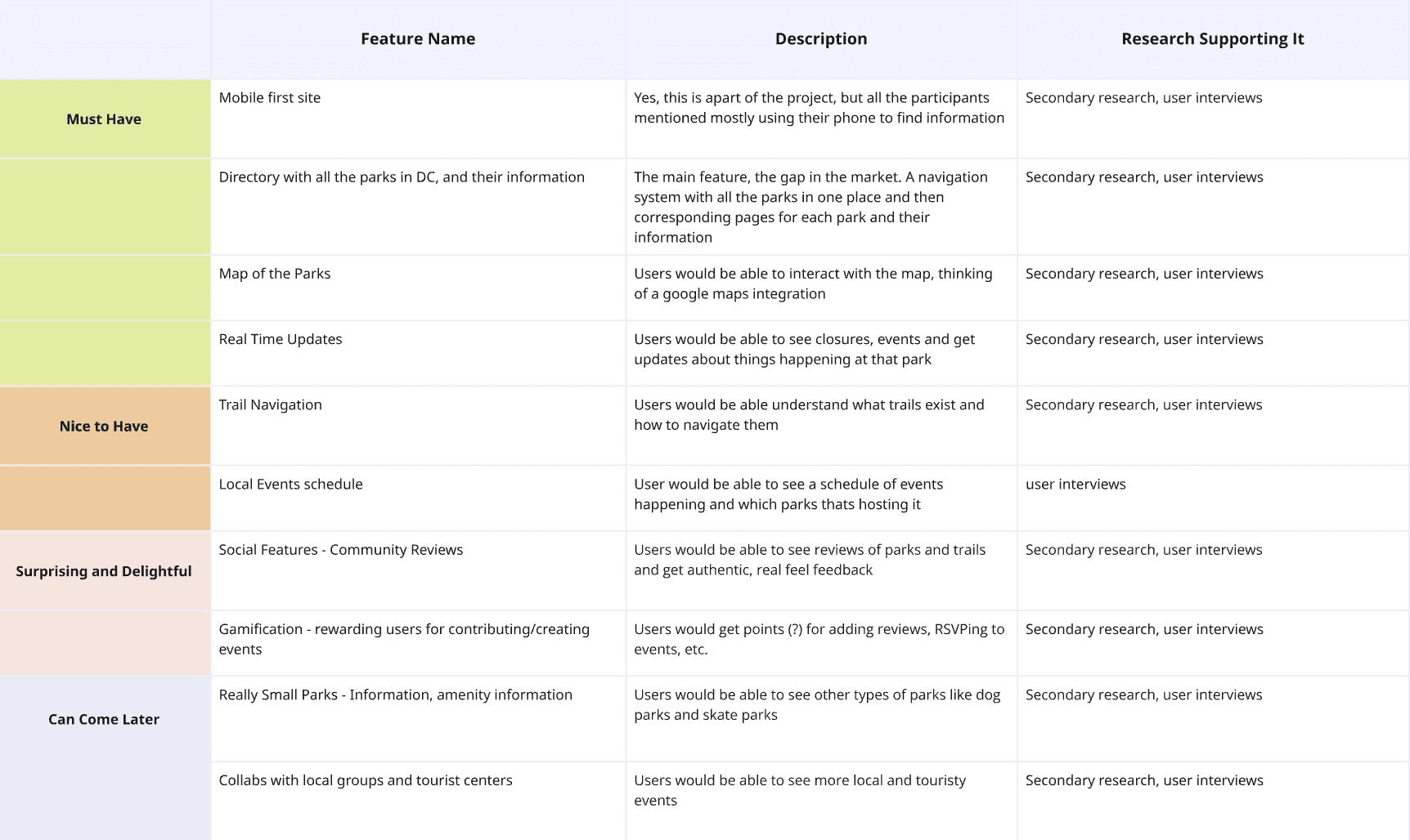 Secondary features such as trail navigation and event schedules were categorized as “nice to have,” enhancing usability without compromising simplicity.