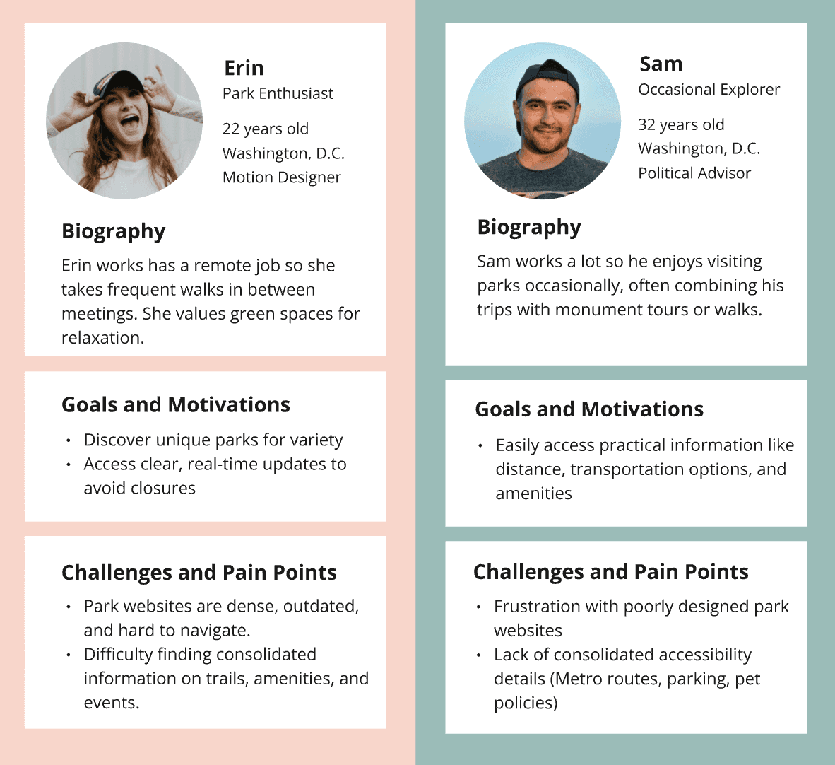 Research and usability testing confirmed that D.C. residents like Erin and Sam often spend too much time searching across scattered websites for simple park details or event updates. Erin shared that “it’s hard to know what’s happening nearby without digging through multiple pages,” while Sam noted frustration with “not knowing which parks are open or Metro-accessible.”