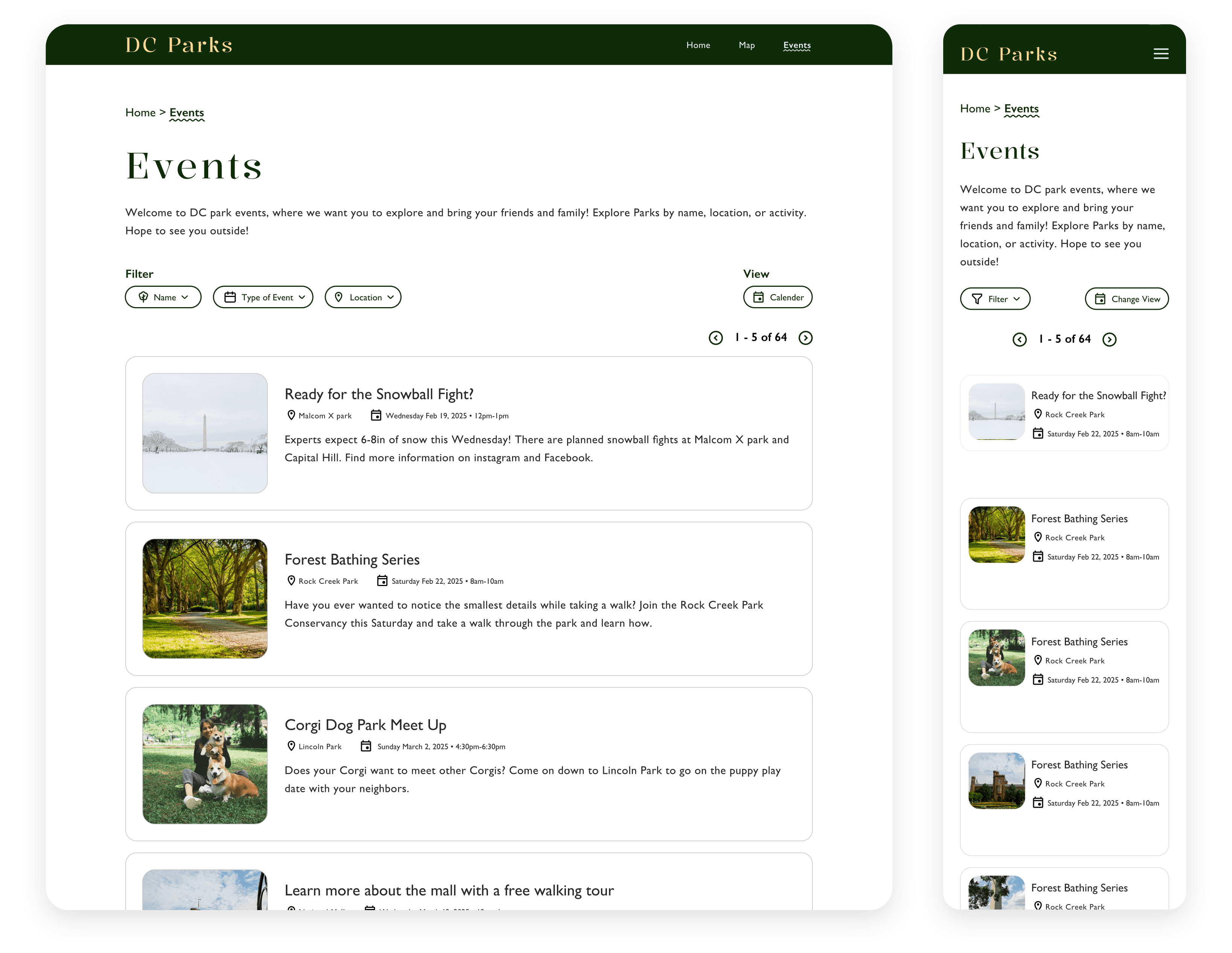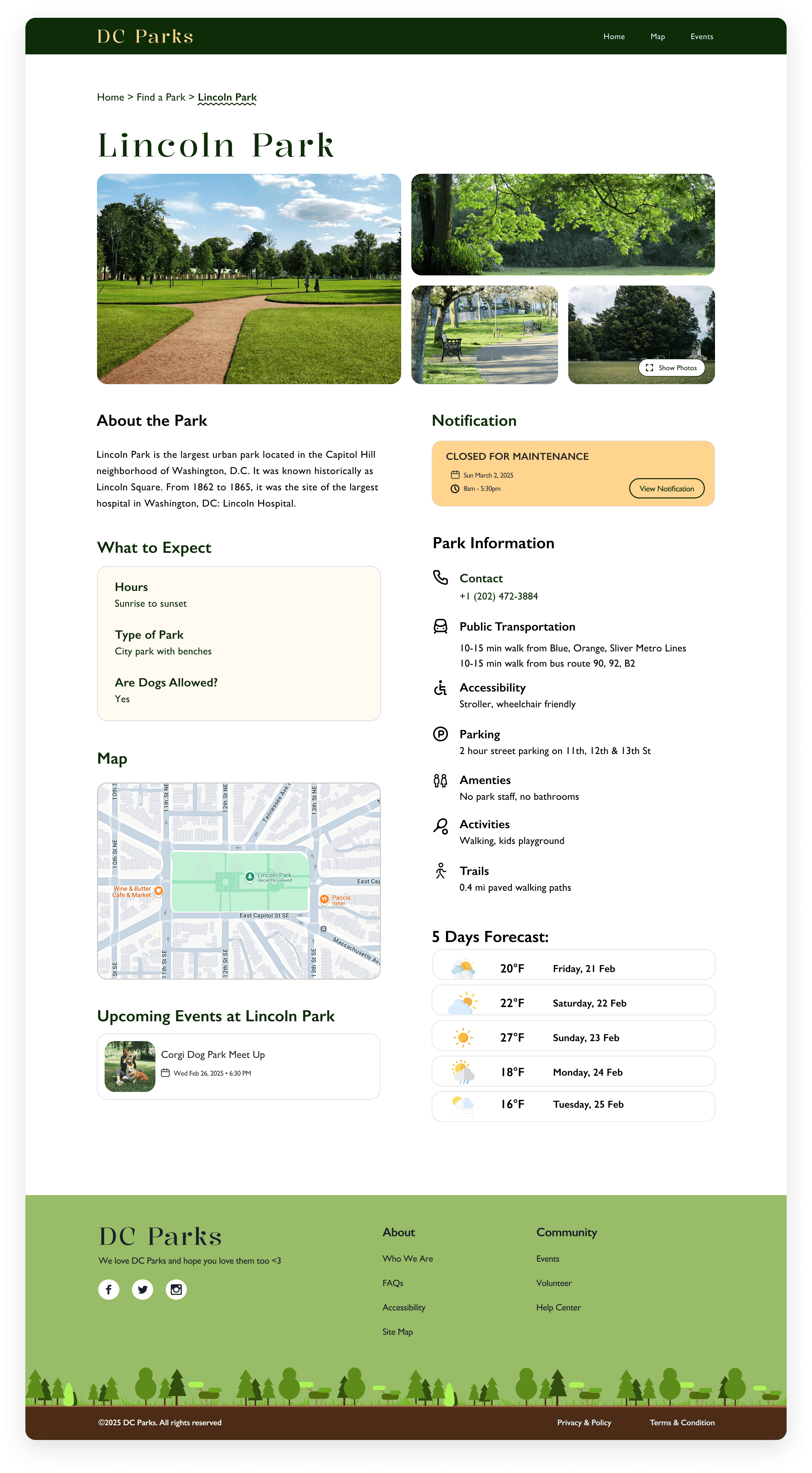 Looking back, this project strengthened my understanding of how thoughtful design can simplify civic experiences. As a designer, I learned the importance of grounding every decision in real user needs—balancing accessibility, usability, and visual clarity to make public information more approachable. The platform successfully centralized park and event details, streamlining how residents and visitors engage with D.C.’s green spaces.