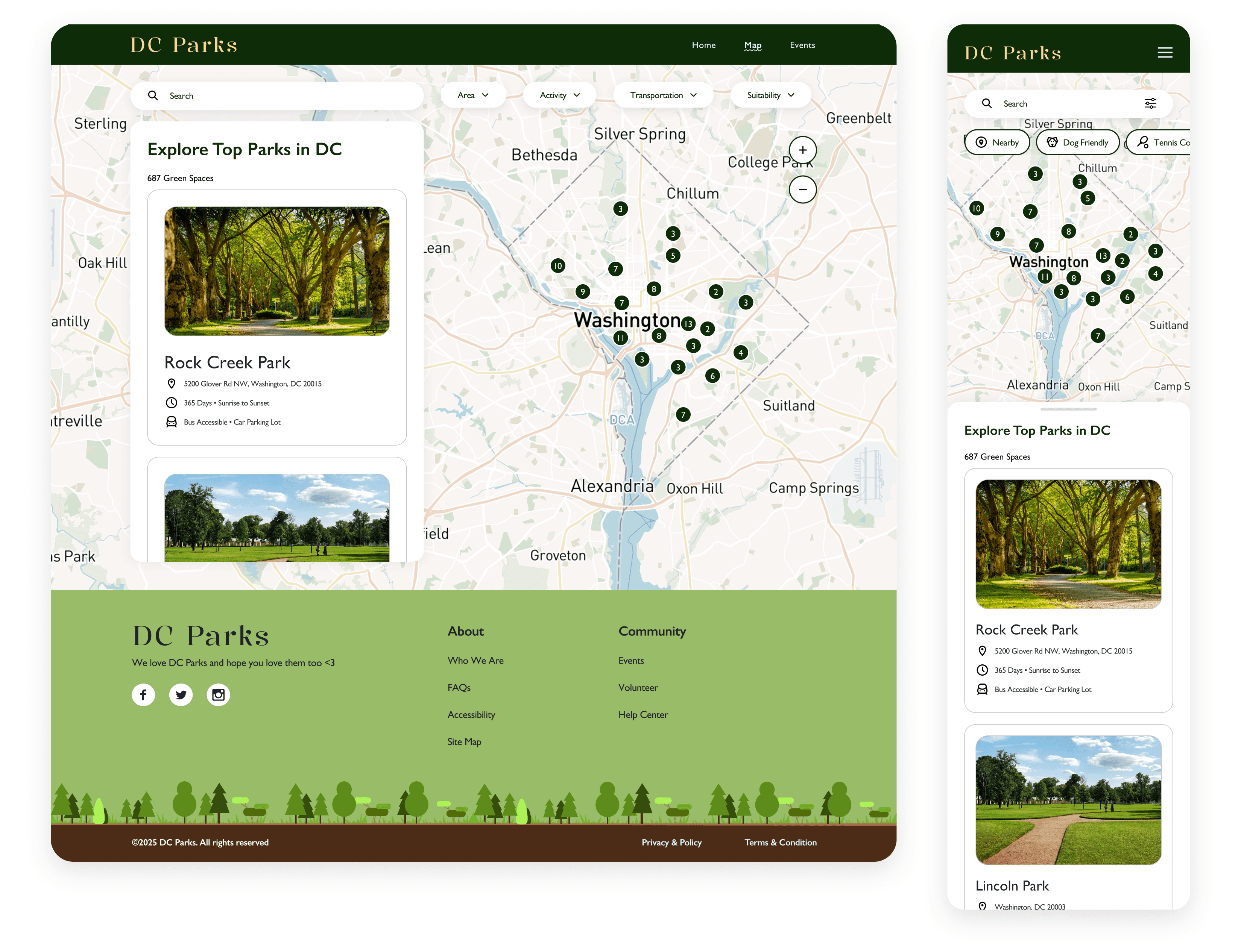 The design decisions, like high-contrast visuals for outdoor readability and mobile responsiveness, were guided by user research insights and the brand’s goal of making D.C.’s parks feel open, engaging, and easy to explore.