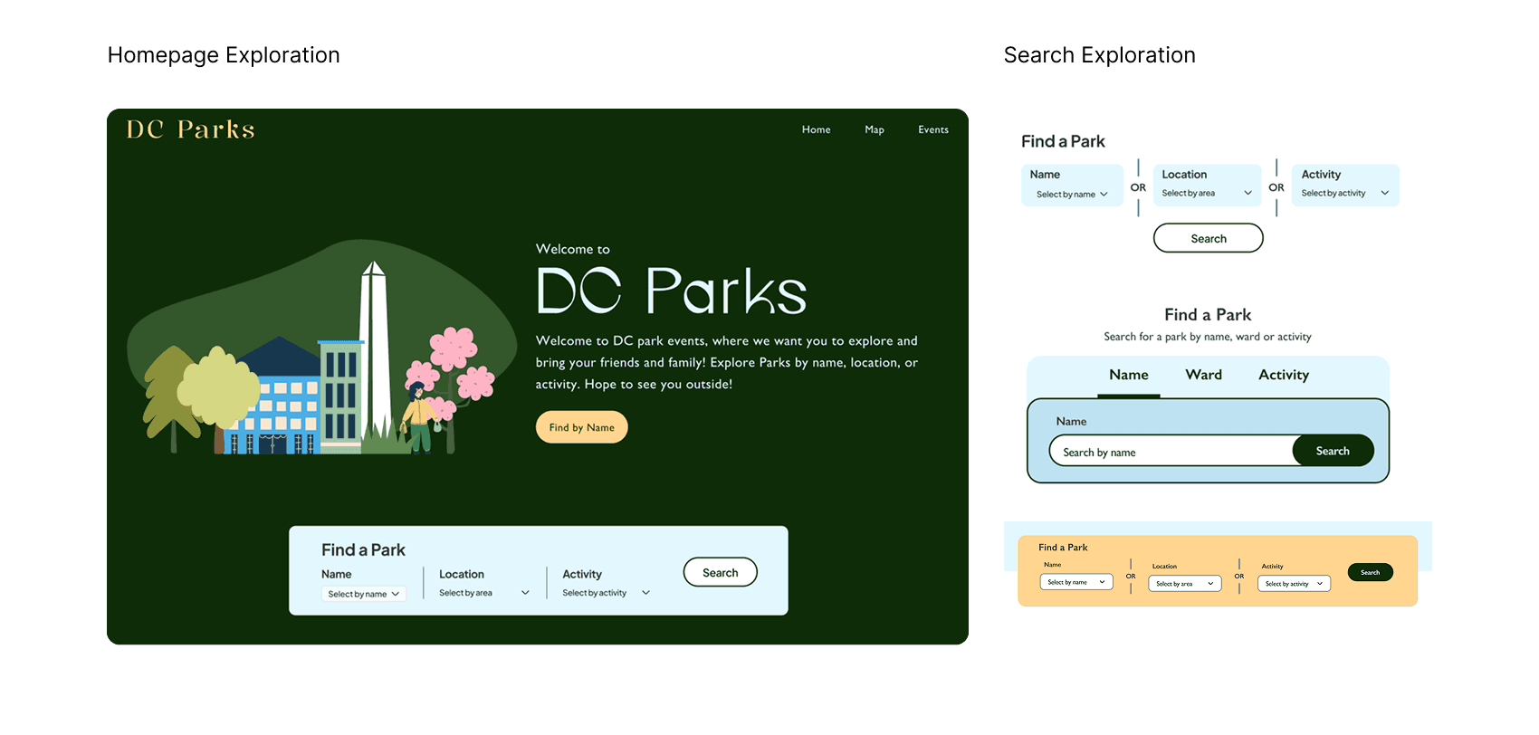 The visual design intentionally moved away from the rigid, formal aesthetic of government websites, evolving through multiple iterations to create a more playful and approachable system. One of the most refined components was the homepage search feature, where I explored different layouts and interactions inspired by Airbnb and AllTrails to allow users to type a query or quickly select a filter from a dropdown.