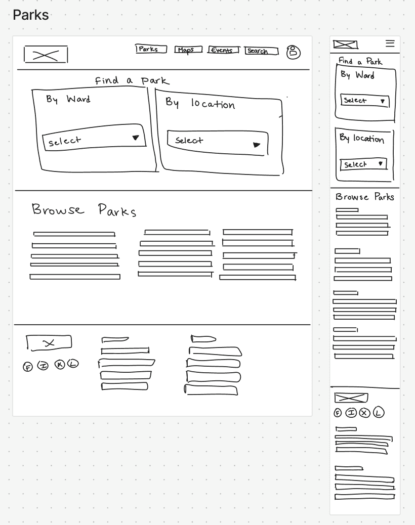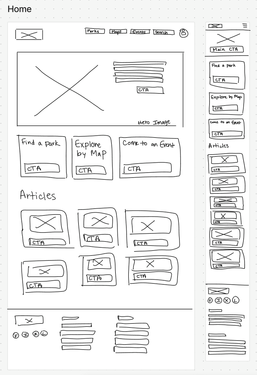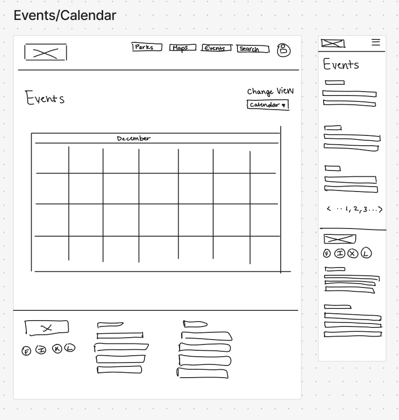 The other pages like the parks map, event listing, event detail page, and supporting navigation screens, were developed to test a complete and intuitive user flow. Each wireframe was annotated to clarify the purpose of every block, ensuring content hierarchy remained consistent and easy to follow. High-contrast visuals, responsive layouts, and clear typography were intentionally chosen to support users planning visits outdoors and on mobile devices, aligning with research insights about how D.C. residents discover parks on the go.