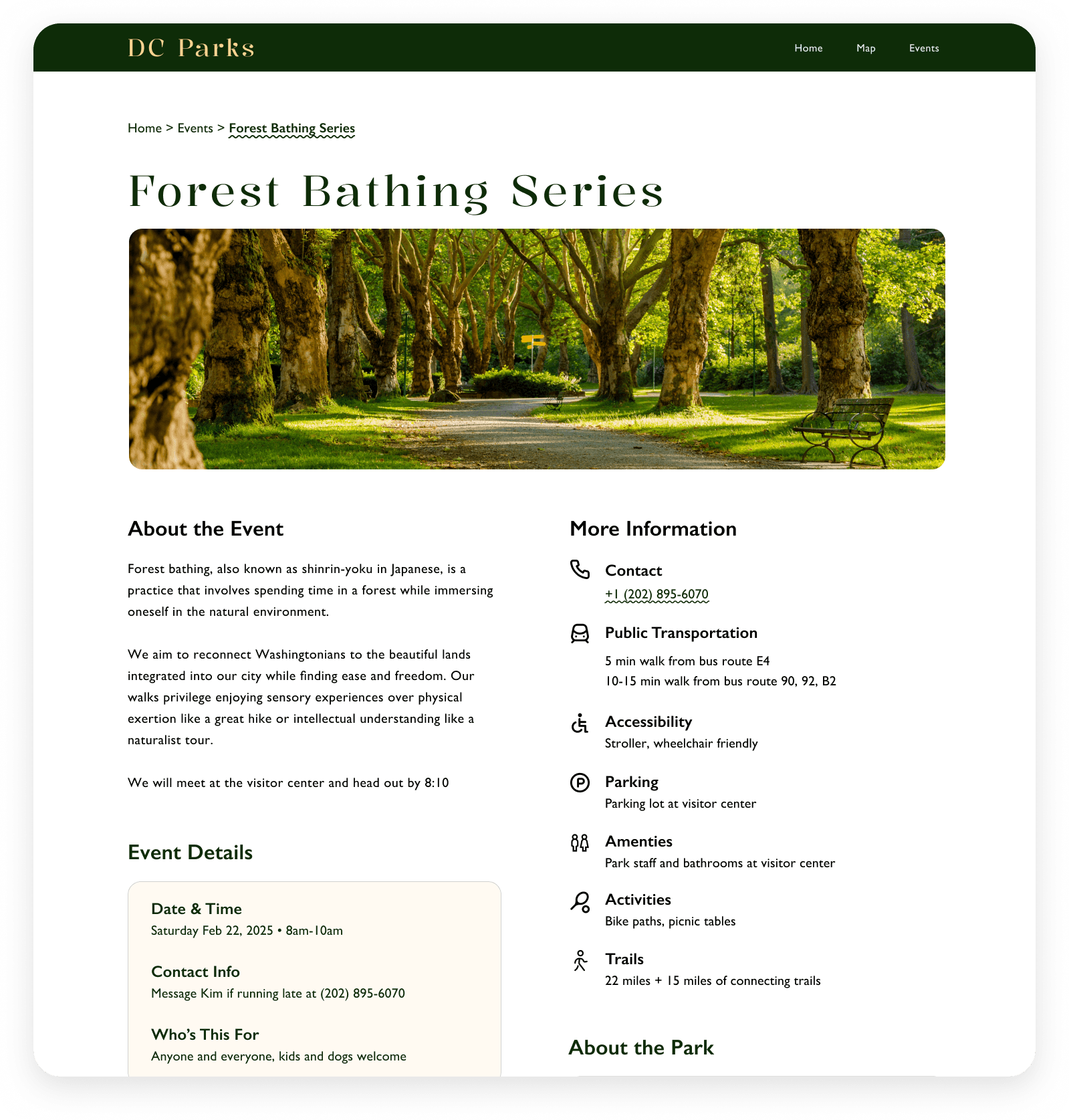 The redesigned DC Parks website consolidates park and event information into one easy-to-navigate platform. It allows users to quickly locate parks, learn about amenities, discover upcoming events, and plan their visits, all from a single, mobile-friendly site.