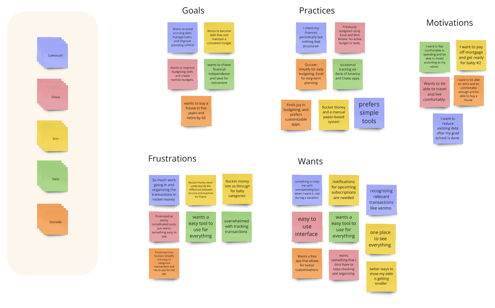 An affinity mapping exercise was conducted to synthesize insights from user interviews, revealing clear patterns in financial behaviors, frustrations, and emotional needs.