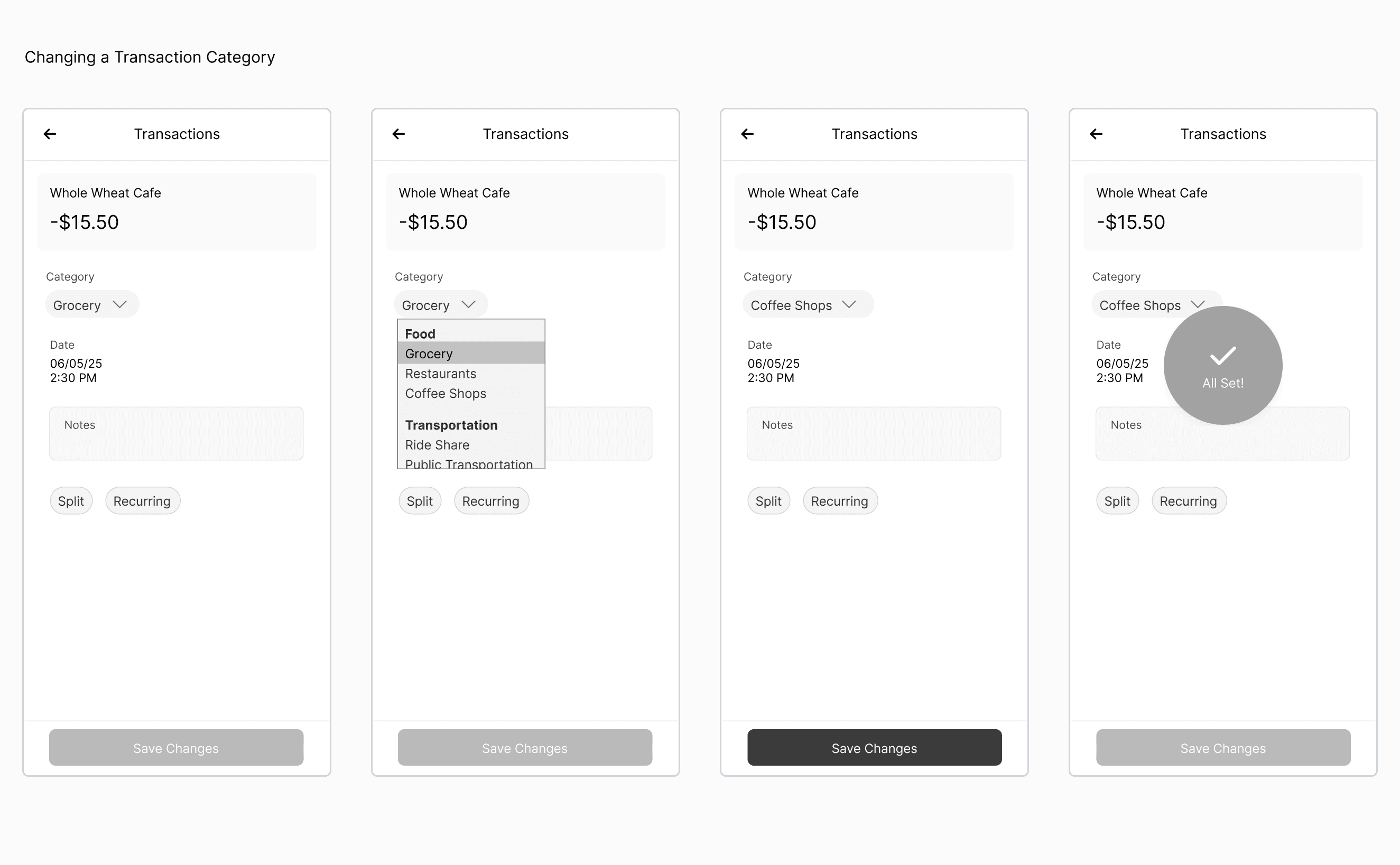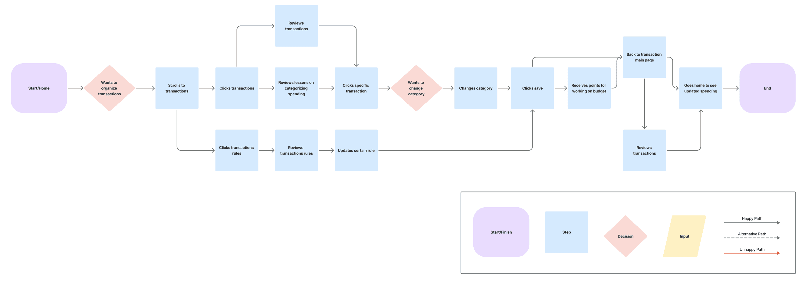 Task flows were mapped for the primary use case of changing a transaction category.