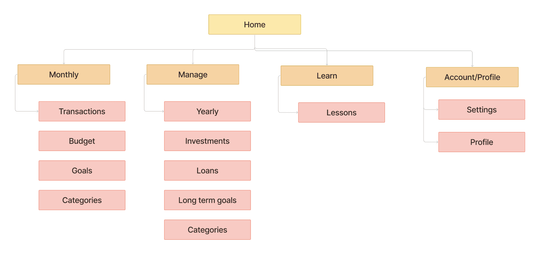 The sitemap balances simplicity with depth, ensuring users can easily navigate everyday tasks while exploring advanced financial features as their confidence grows.