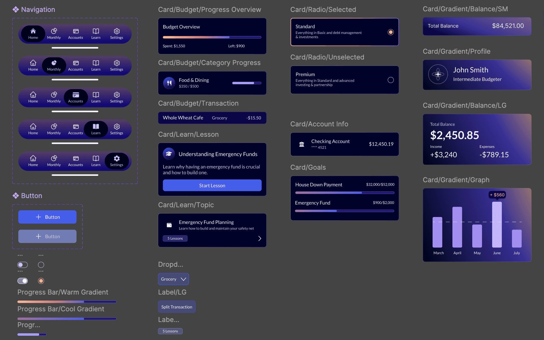 Each element reflects the app’s visual language, combining rounded edges, soft gradients, and calming colors with functional clarity. The progress bars, in particular, were designed to blend aesthetic appeal with precise readability, reinforcing the brand’s balance of emotional ease and financial insight. Together, these pieces form a cohesive design toolkit that makes future iterations efficient and scalable.