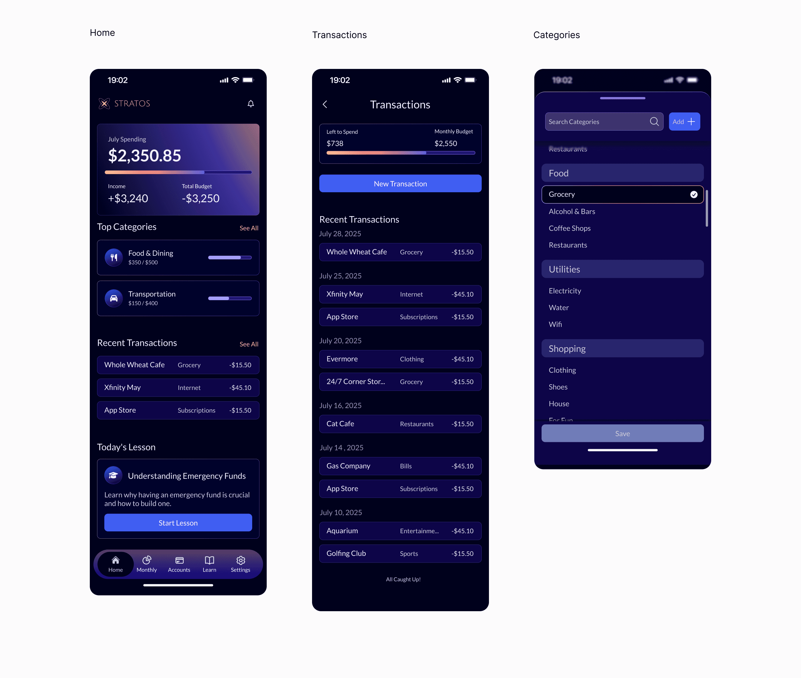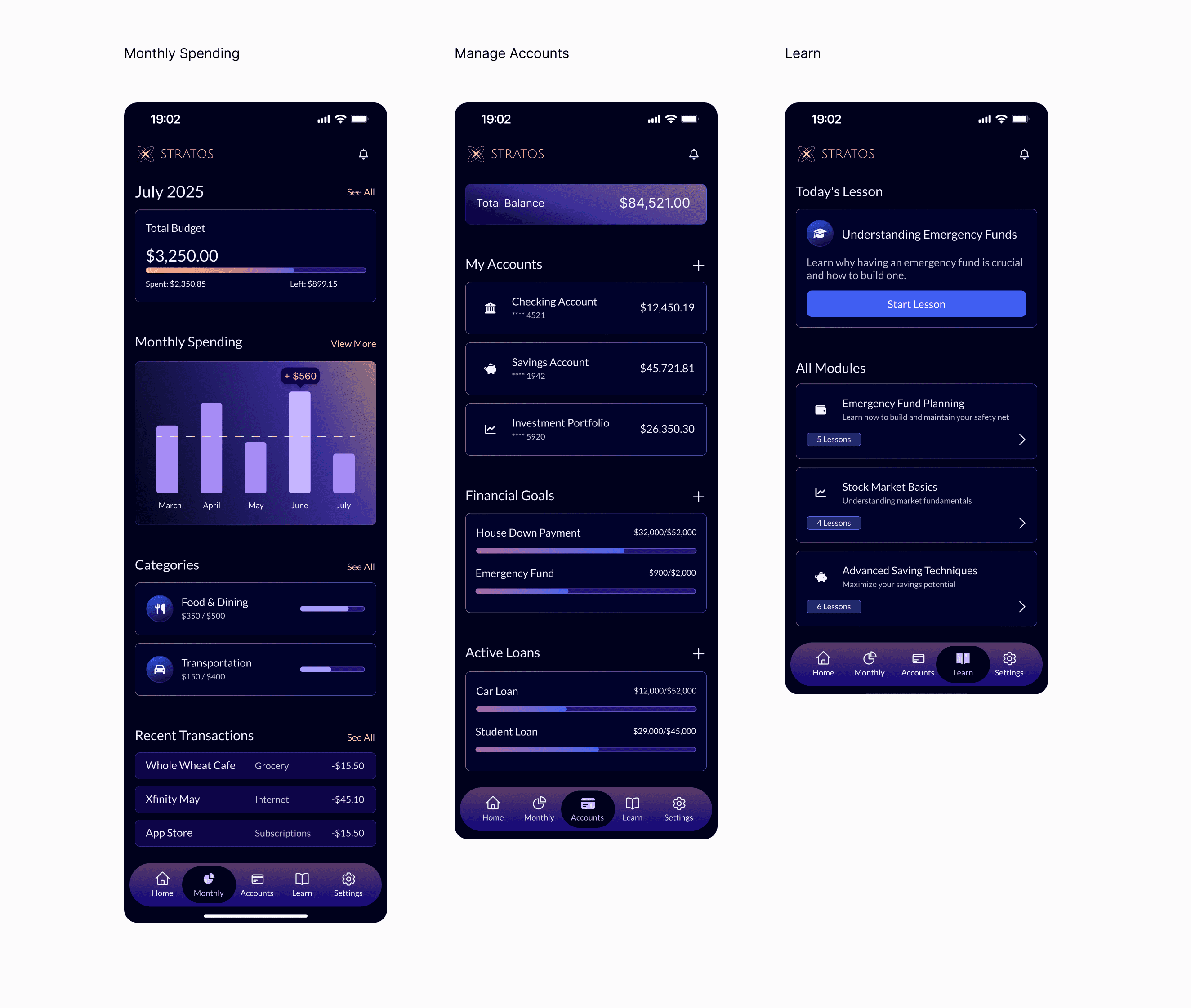 The high-fidelity mockups for Stratos showcase a refined, fully developed visual system that brings the product’s core financial tools to life across key screens such as Home, Transactions, Monthly Spending, Manage Accounts, and the Learning page.