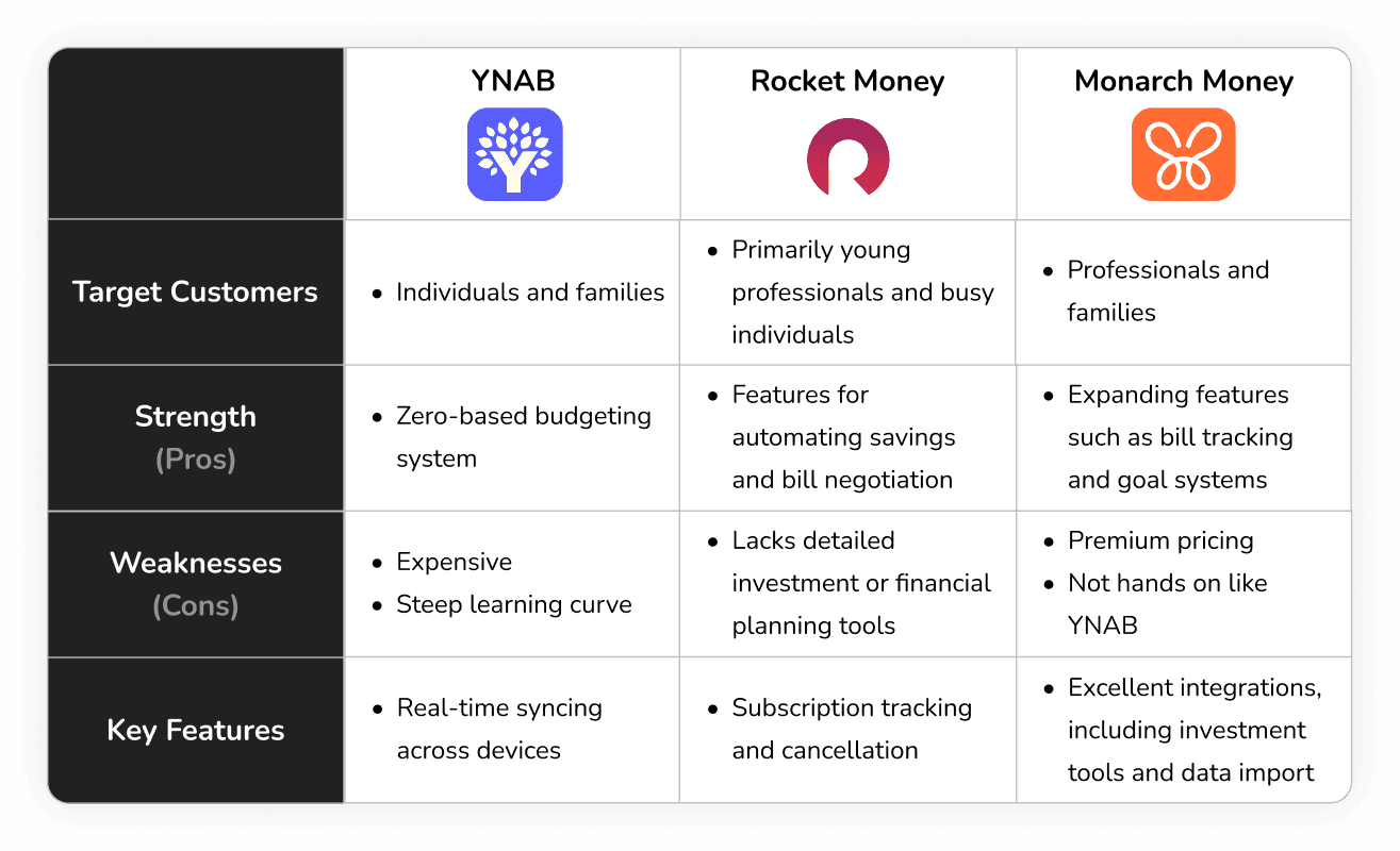 A competitive analysis was conducted to better understand the strengths and gaps of leading budgeting tools including YNAB, Rocket Money, Simplifi, Quicken, and PocketGuard.