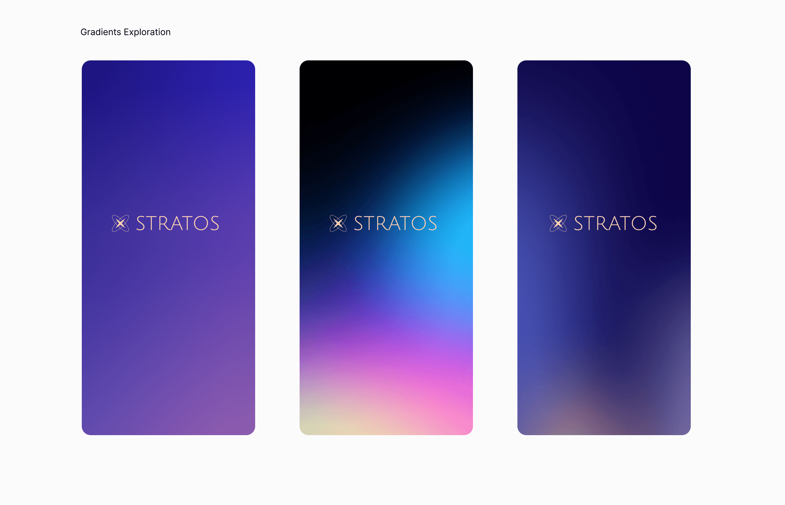 The visual design of Stratos evolved through deliberate exploration of gradients, card structures, and navigation patterns to create an experience that feels calm, trustworthy, and uplifting. Early gradient studies helped define the brand’s atmospheric aesthetic, soft lavender-to-navy blends and subtle pink accents that signal ease and emotional reassurance.