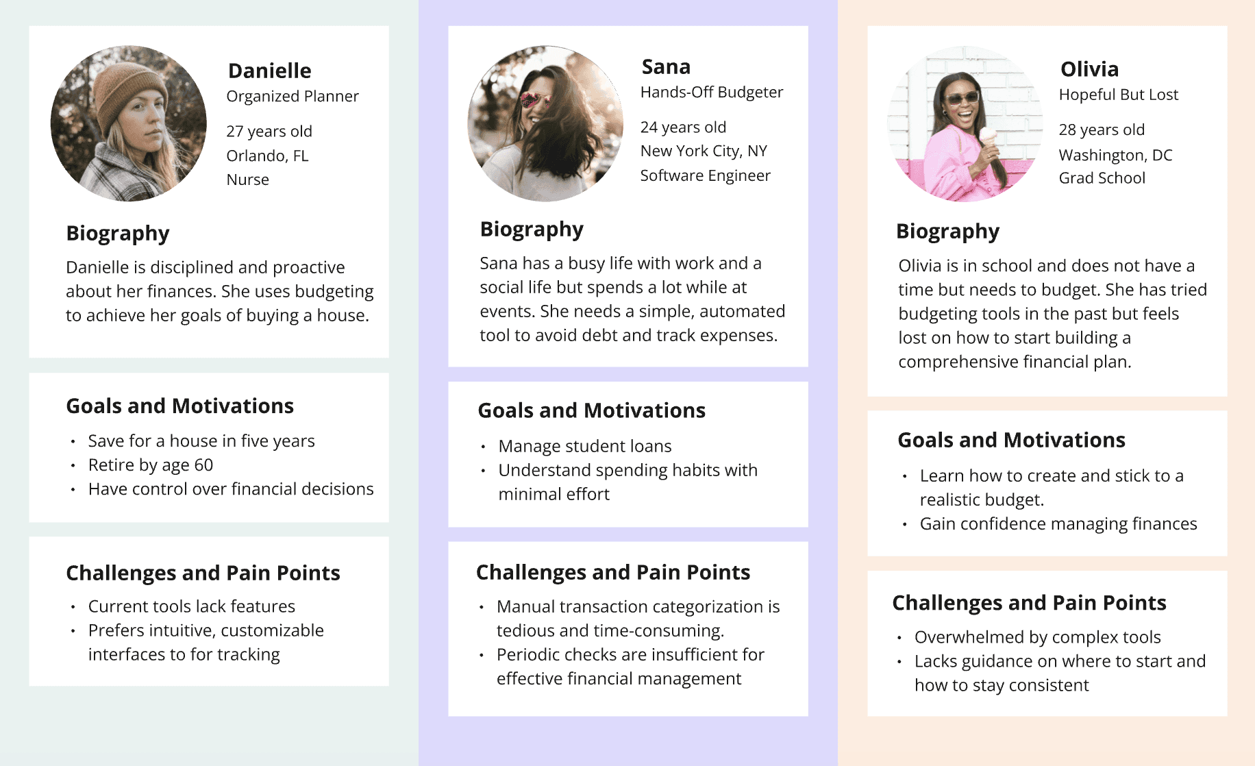 Three core personas were developed to reflect the spectrum of budgeting attitudes and needs uncovered during research.