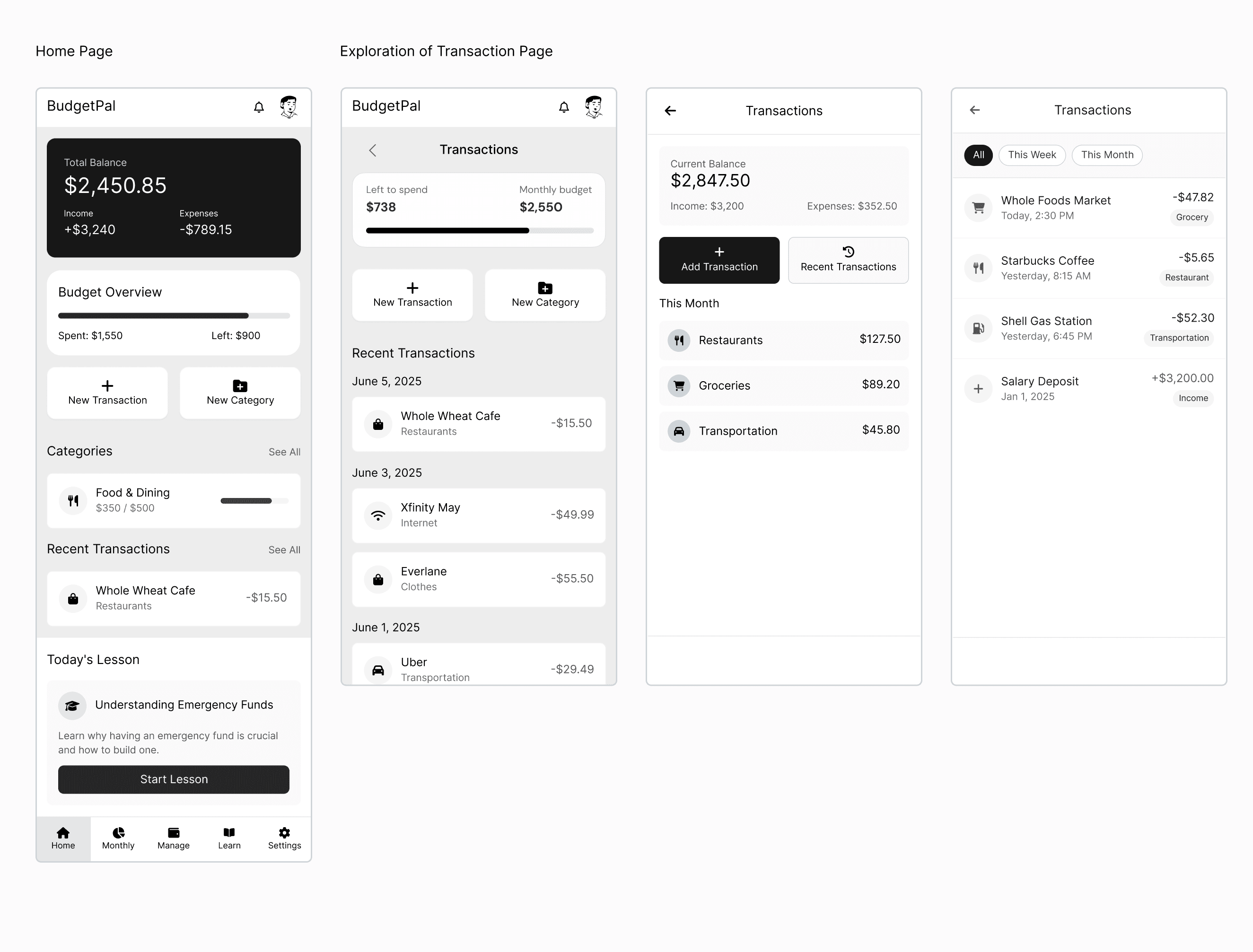 Key screens, such as the homepage and budget overview card, went through multiple iterations to balance clarity with visual warmth; the redesigned budget card in particular shifted toward a cleaner hierarchy, rounded edges, and refined contrast to help users quickly understand their spending without feeling overwhelmed.